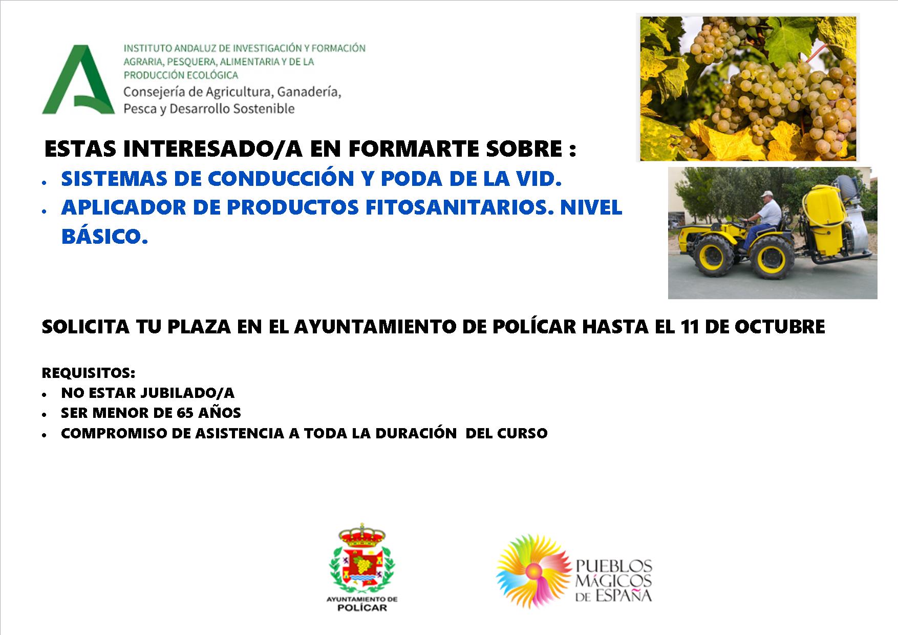 Formación sobre: * Sistema de Conducción y Poda de la Vid. * Aplicador de Productos Fitosanitarios. Nivel Básico.